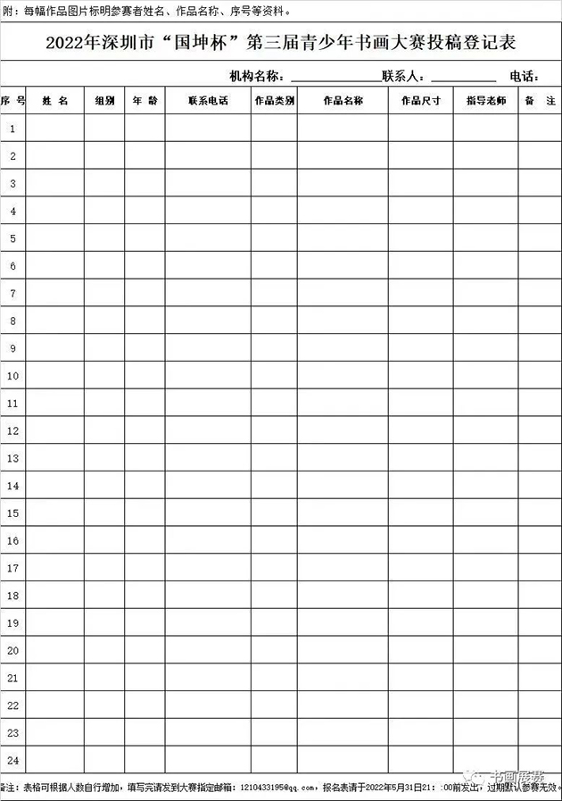 3、投稿要求:参赛一律以集体组织投稿,每个机构来稿总数不超过100幅,作品背面右下角注明学校或机构名称、姓名、年龄、年级、组别、指导老师和详细通讯地址、联系电话,并附《集体参赛作品登记表》。